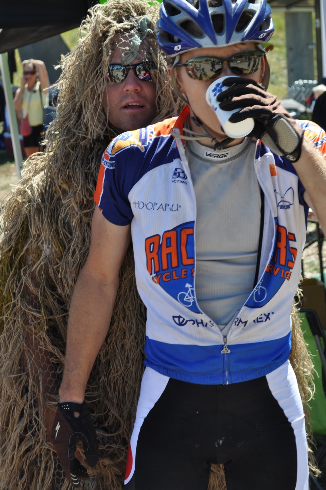 If you can get past the dry-humping, you'll also notice in the previous picture that I'm wearing a pretty warm base layer. I'm wearing this despite the fact that it was hot has hades out there. So why didn't I take it off? (I'm sure you're dying to know). Because it goes against my endurance racing mantra, which is "keep pedaling, dammit!" I may not do a lot of things well on a bike. I don't have bursts of speed up steep hills. I can't do wheelies or do cool tricks. All I got is the ability to continue pedaling when all logic and reason tells me to stop. This can be a good and a bad thing.